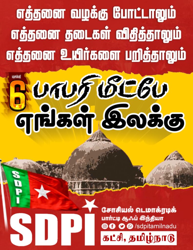 நேற்று, டிசம்பர் 6 அன்று பல்வேறு இடங்களில் எஸ்டிபிஐ கட்சியின் சார்பில் ஆர்ப்பாட்டம் நடைபெற்றது. உத்தரப் பிரதேசம் மாநிலம் அயோத்தியில் உள்ள பாபர் மசூதி 1992 ஆம் ஆண்டு டிசம்பர் 6 ஆம் தேதி கரசேவர்களால் இடிக்கப்பட்டது. அதைத் தொடர்ந்து ஒவ்வொரு ஆண்டும் டிசம்பர் 6 ஆம் தேதி பாபர் மசூதி இடிப்பு தினம் அனுசரிக்கப்படுகிறது.